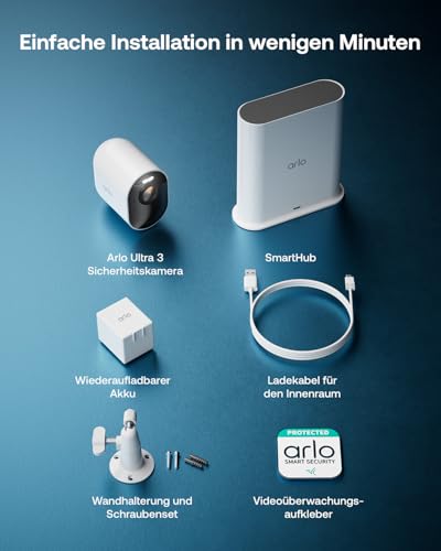 | Lieferumfang | Kamera, Akku, USB-C-Ladekabel, Netzteil, Wandhalterung, Schraubenset, Ultra SmartHub (VMB5500), Kurzanleitung, Aufkleber |