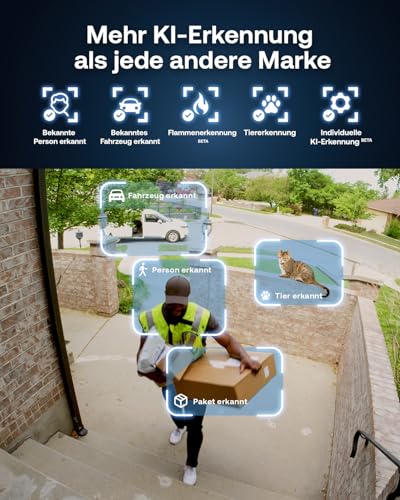 - Integrierte Sirene und KI-Alarme (Pakete/Feuer)